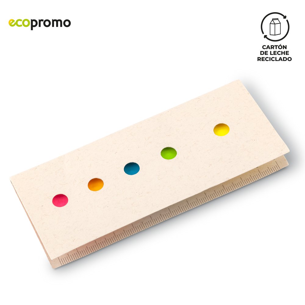 Set de portastickies en cartón reciclado de leche. Con regla de 12 cm y 5 stickies de colores. Medidas: 13 cm x 5.5 cm x 0.4 cm.