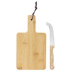 Bambú + Acero inoxidable. Set de tabla de corte para quesos y cuchillo. Tabla con recubrimiento de aceite vegetal y correa en el mango. Cuchillo de 19,5 cm de largo, de acero inoxidable 420 y mango de madera . Presentación en caja de regalo kraft. 22 x 12 x 1,2 cm.