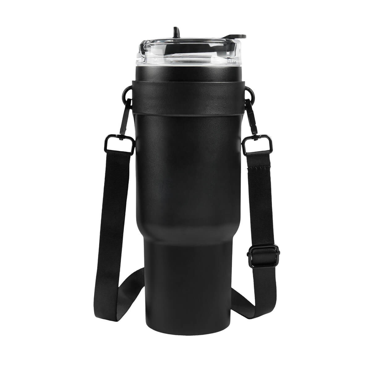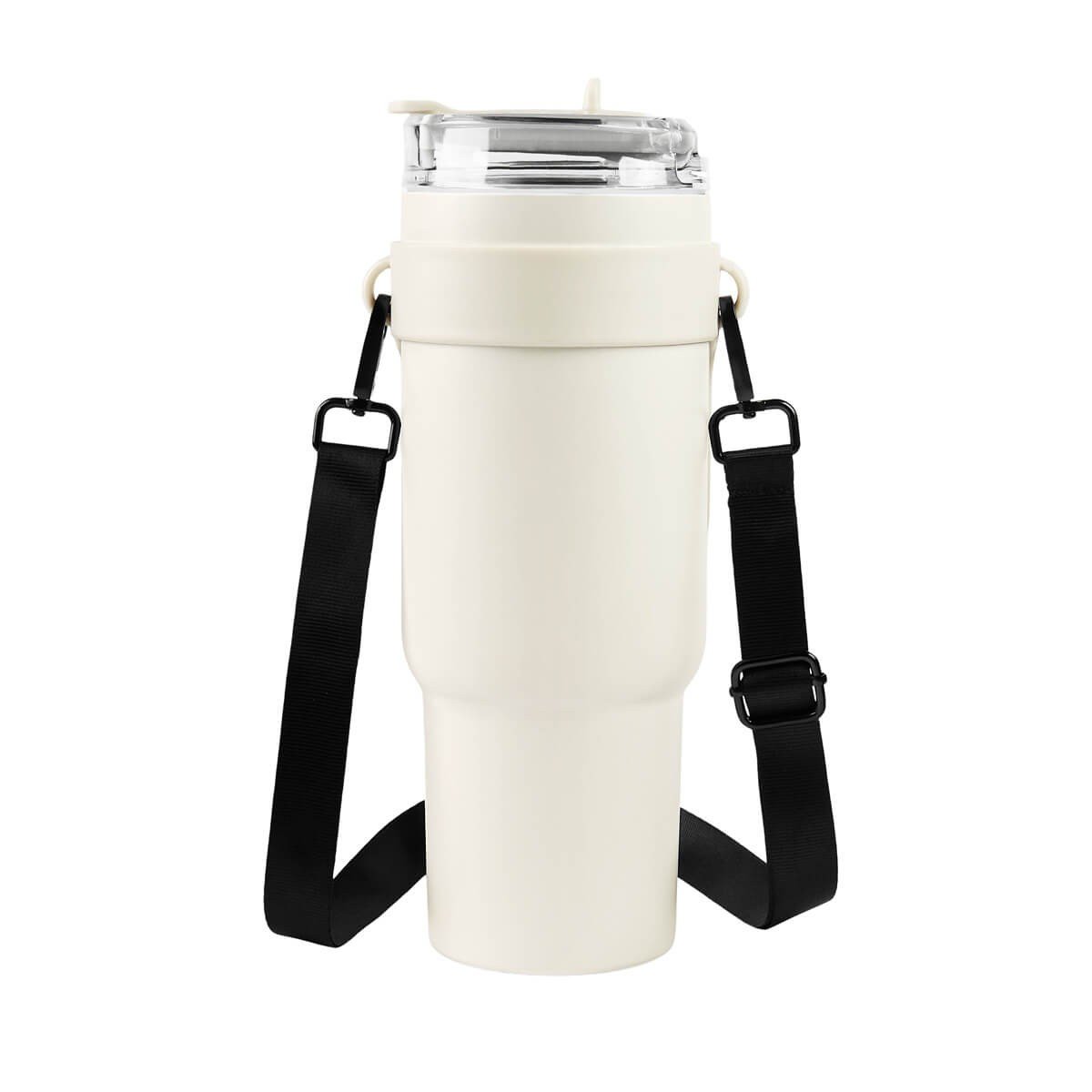 Termo doble pared. Cerrado al vacio. Pared interna y externa de acero inoxidable. Terminado rugoso que facilita su agarre. Incluye tapa de plastico con sistema de rosca y la sobretapa mulitfuncional, permite beber por medio de su boquilla clasica o a traves de su boquilla plegable con popote. Su diseno innovador incorpora un asa plegable para un uso mas practico y un asa para hombro ajustable y removible, con broches metalicos. Mantiene las bebidas calientes hasta por 6 hrs y frias hasta por 8 hrs. Capacidad de 30 Oz. Base de 7.4 cm de diametro. Incluye caja individual. TAMAÑO: 11.5 x 26 x 11 cm