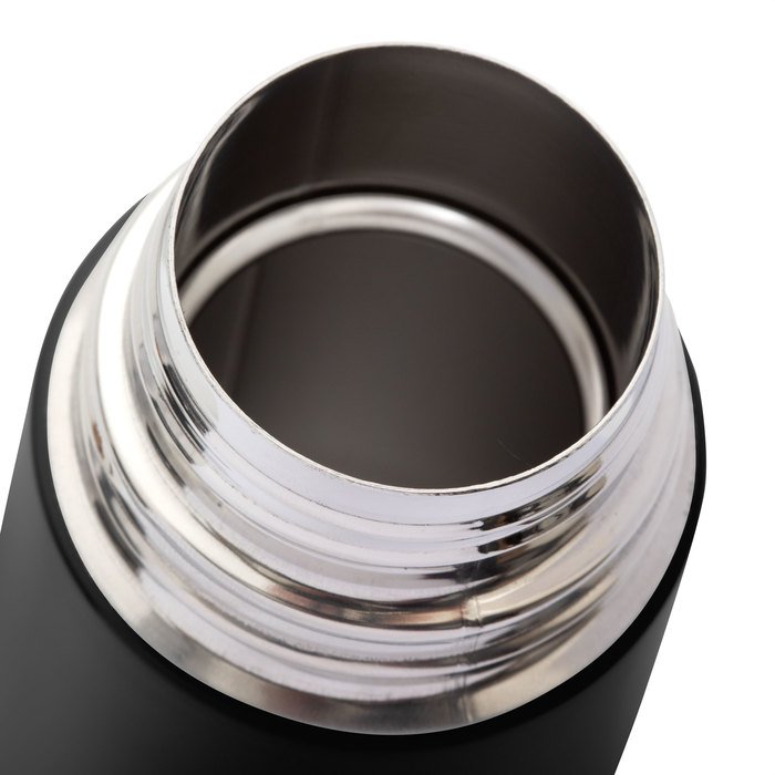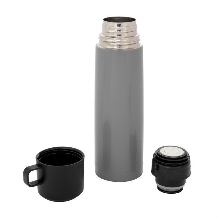 Termo con doble pared sellado al vacío. Acero inoxidable 304 interior / 201 exterior. Tapa y taza plásticas en color negro. Pintura acabado mate. Mantiene hasta 6 hs la temperatura de las bebidas calientes y 12 hs de las bebidas frías. Medidas: 24 cm x 7 cm de alto. Capacidad: 500 ml. Materiales: Acero inoxidable y Polipropileno.