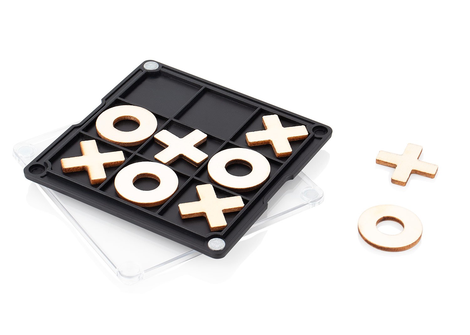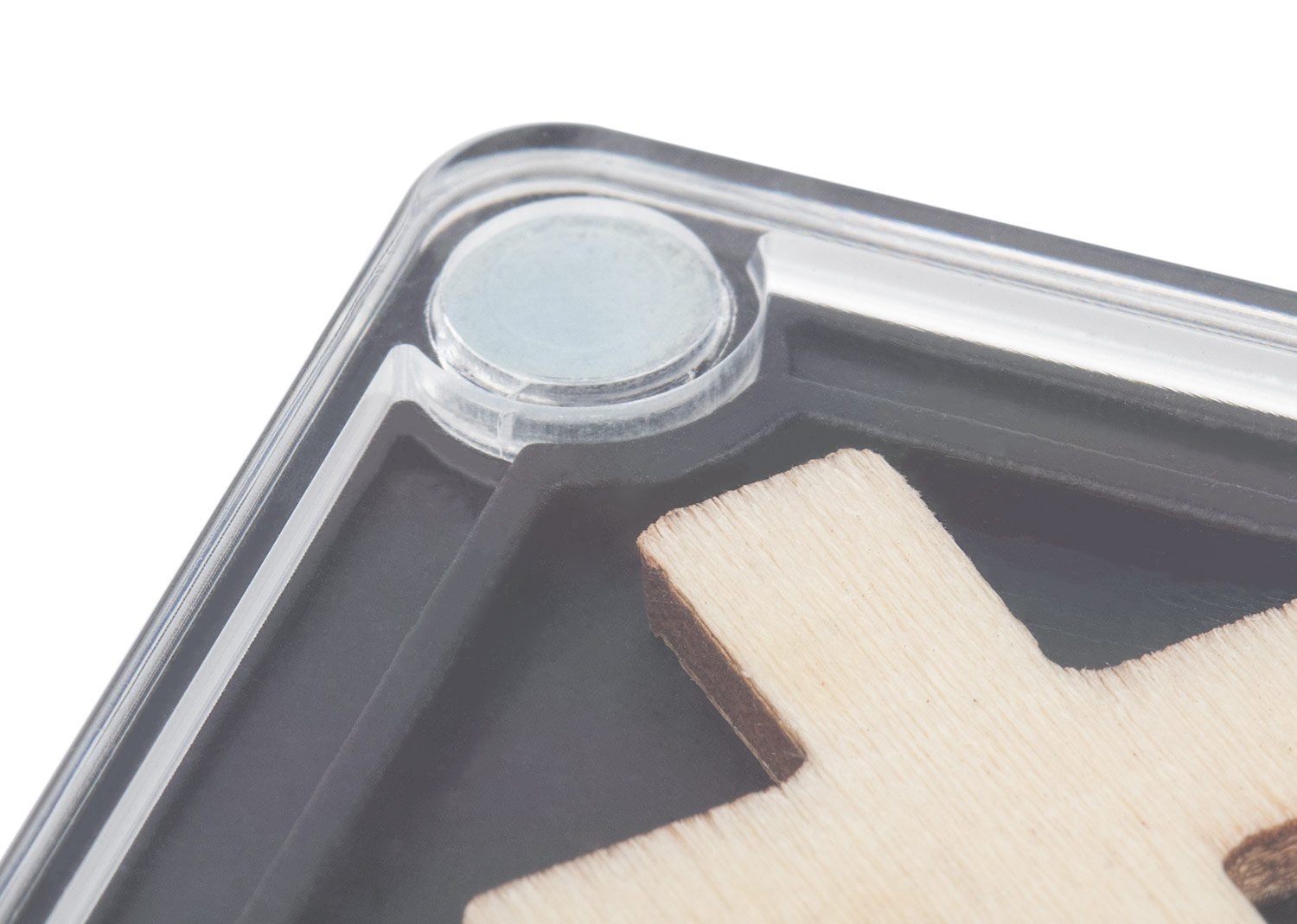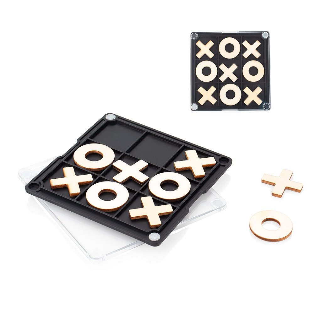 Portavasos de plástico con esquinas imantadas que permiten fijarlo a superficies metálicas; en su interior incluye un juego de triqui de madera con piezas con forma de “X” y “O” (2,2 X 2,2), ideal como accesorio decorativo y funcional para escritorio o espacios de entretenimiento. MATERIAL: Plástico + Madera, MEDIDAS: Formato: (Ancho X Alto X Profundo): (8,5 X 8,5 X 0,6). Peso: 33 gr.